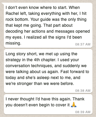 When Lisa ended our 5-year relationship, I was devastated. I couldn't imagine life without her. I spent weeks moping around, drunk-texting her, and begging for another chance. I was a mess to say the least. God blessed me with your guide at the right time. After getting it, I realized I'd lost myself in the relationship. I followed your advice, focused on self-improvement, and subtly showcased my changes on social media. Three months later, Lisa reached out. We met for coffee, and she was blown away by the new me. We've been back together for 4 months now, and just got ENGAGED last week. This works guys. Even though parts of the guide might sound crazy when you first read it, just do what it says and trust me you'll get her back.